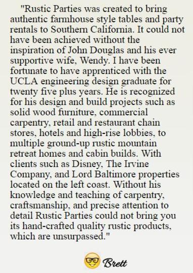 "Rustic Parties was created to bring authentic farmhouse style tables and party rentals to Southern California. It could not have been achieved without the inspiration of John Douglas and his ever supportive wife, Wendy. I have been fortunate to have apprenticed with the UCLA engineering design graduate for twenty five plus years. He is recognized for his design and build projects such as solid wood furniture, commercial carpentry, retail and restaurant chain stores, hotels and high-rise lobbies, to multiple ground-up rustic mountain retreat homes and cabin builds. With clients such as Disney, The Irvine Company, and Lord Baltimore properties located on the left coast. Without his knowledge and teaching of carpentry, craftsmanship, and precise attention to detail Rustic Parties could not bring you its hand-crafted quality rustic products, which are unsurpassed."